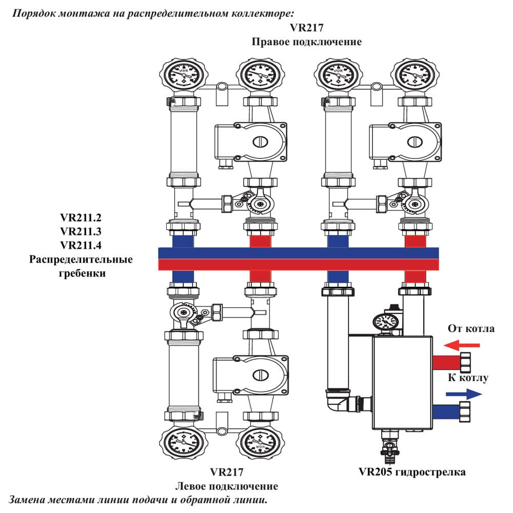 Насосная группа VIEIR VR217-25/6 с трехходовым смесительным клапаном (без насоса) является универсальной насосной группой, по умолчанию поставляется с правым подключением, но при необходимости насосную группу можно подключить слева, поскольку производитель предусмотрел возможность произвести замену линии подачи и обратной линии.