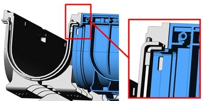 Схема соединительных элементов позволяет быстро собирать лотки в единую линию. Тройная система фиксации надежно удерживает большие дренажные магистрали: