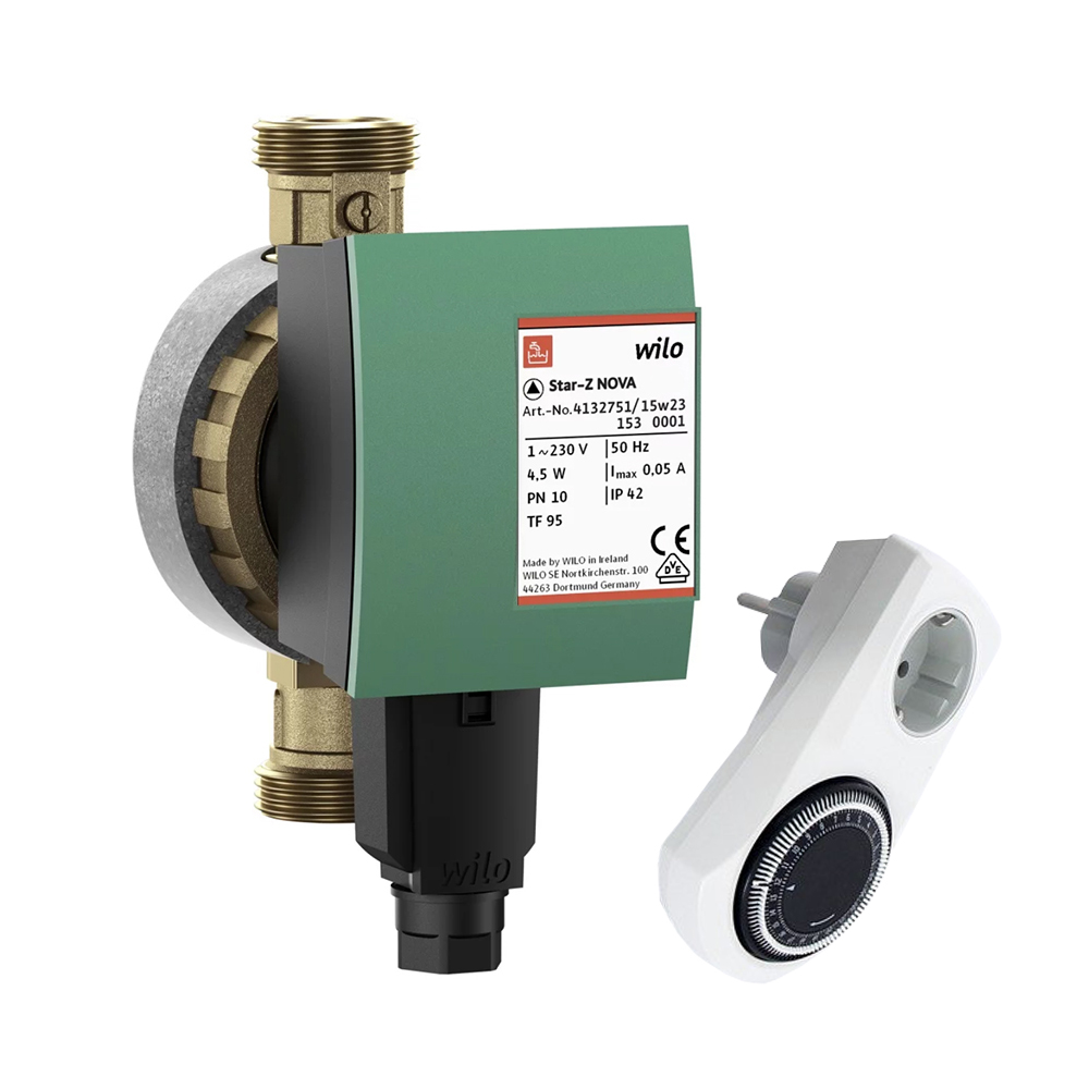 Насос циркуляционный Wilo Star-Z NOVA C – энергоэффективный насос с мокрым ротором для систем горячего водоснабжения. Насос оснащен встроенным обратным кланом с напорной стороны и встроенным запорным клапаном со стороны всасывания. Это избавляет от необходимости покупать и монтировать данные клапаны дополнительно. Поставляется в комплекте со штекерным таймером.Кроме того, насос Star-Z NOVA C снабжен теплоизоляционным кожухом, который снижает потери тепла воды, и укомплектован таймером, включающим насос в работу по заданному времени.