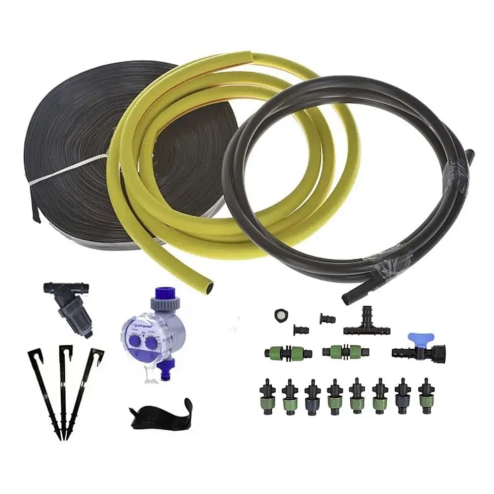 - Полный комплект фитингов и шлангов: Включает магистральный шланг, старт-коннекторы, тройники, заглушки, краны и переходники. Все необходимое для сборки системы на вашем участке.