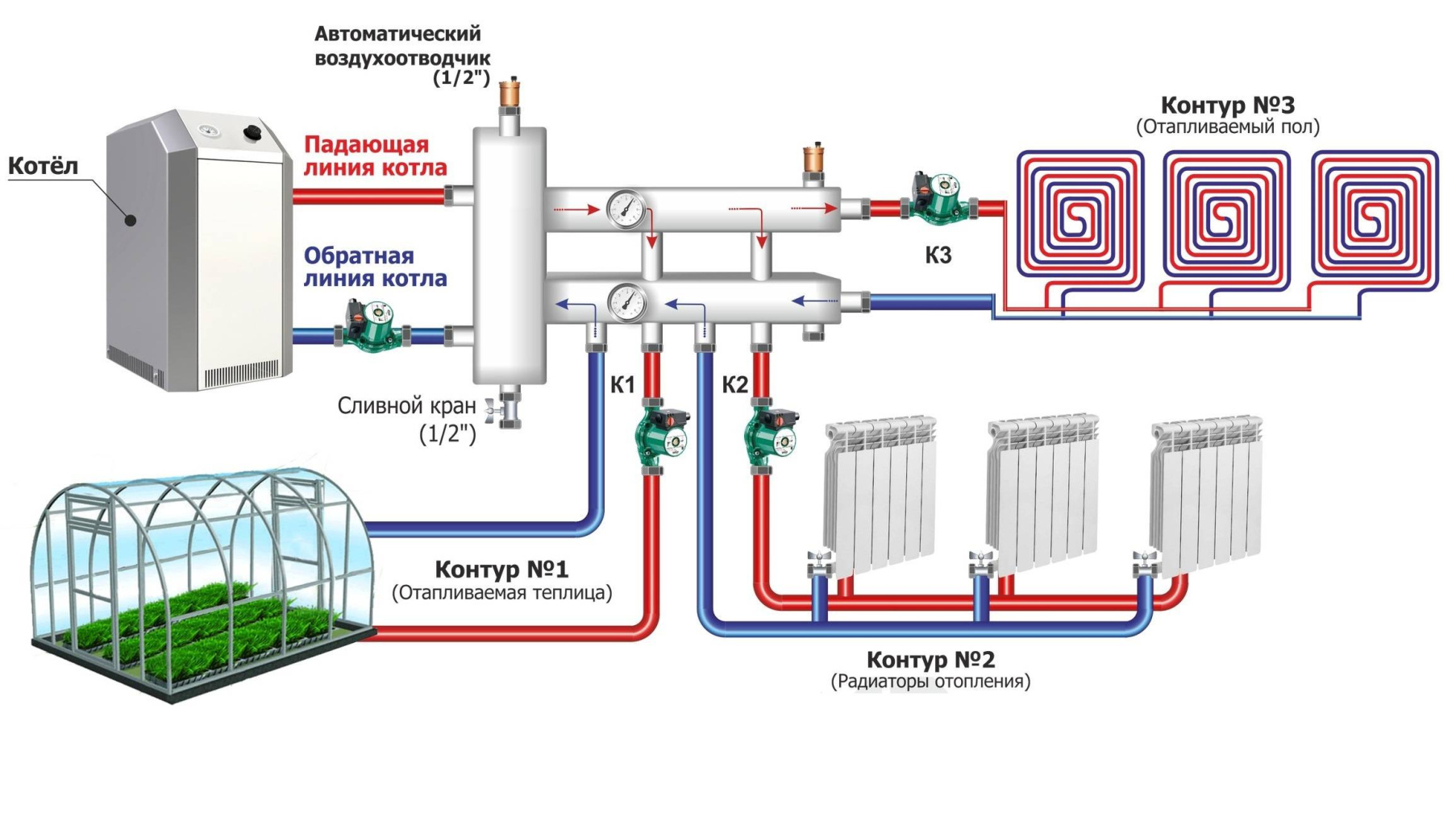 Базовая схема: котёл → гидрострелка → коллектор отопления