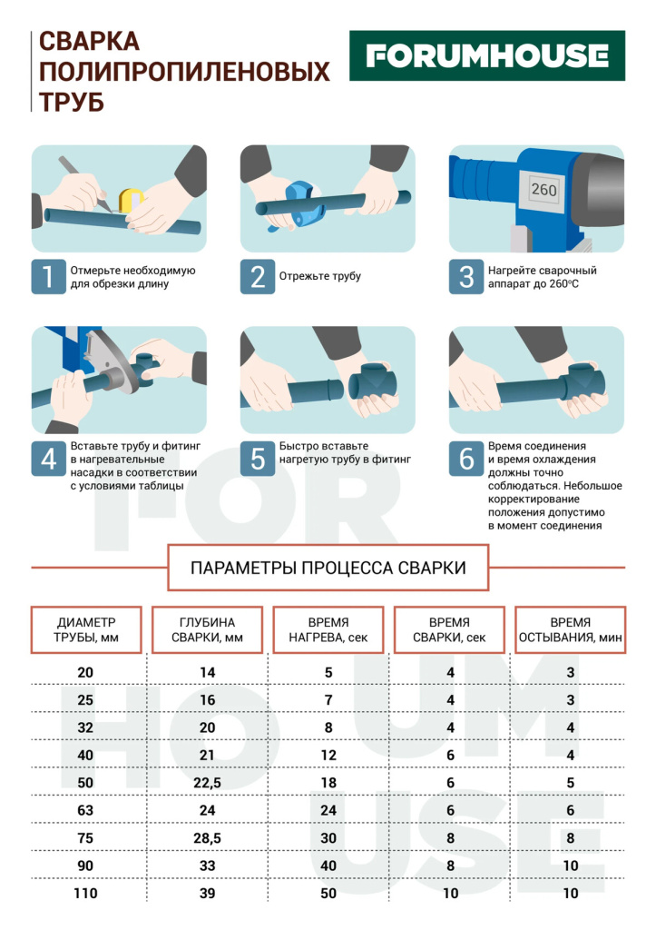 | Диаметры полипропиленовых труб, мм. | Глубина сварки, мм. | Время нагрева трубы, сек. | Время соединения труб и фитингов, сек. | Время остывания полипропиленовой трубы, мин. |